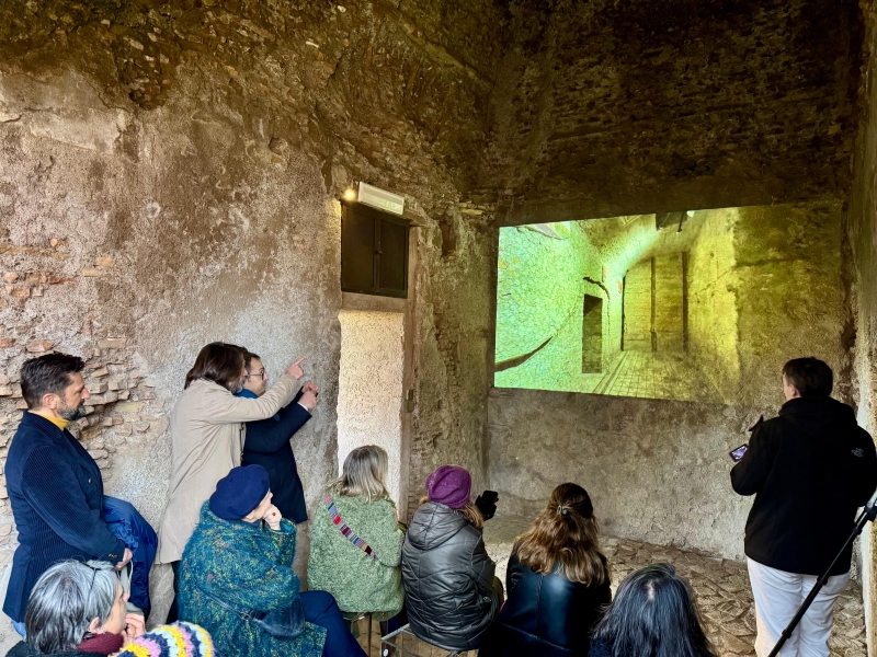 Fondamentale, in questo passaggio, il contributo di Comoli Ferrari, che ha partecipato al progetto in qualità di sponsor tecnico, rendendo possibile l’apertura definitiva del sito. L’accesso diretto alla porzione ipogea della domus, infatti, risulta particolarmente complesso a causa di una scala molto ripida, incompatibile con una fruizione inclusiva. Per questo è stata progettata una modalità di visita innovativa: i visitatori, accolti in un ambiente protetto da una nuova copertura in rete microforata che ricostruisce il profilo del vano scala del Palazzo Flavio, possono assistere alla visita guidata in tempo reale, trasmessa in streaming da una guida dotata di videocamera.